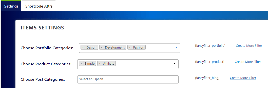 Select the portfolio categories the same way you selected them, using the shortcode next to them. Click “Create more filters”, if you want to create more shortcodes