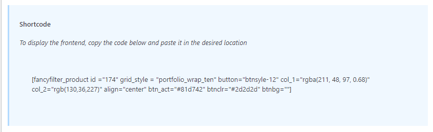 After clicking the Publish button you will see a shortcode generated below the product section like the image below, copy it and paste it into the site of your choice. You will see the filter features on the frontend