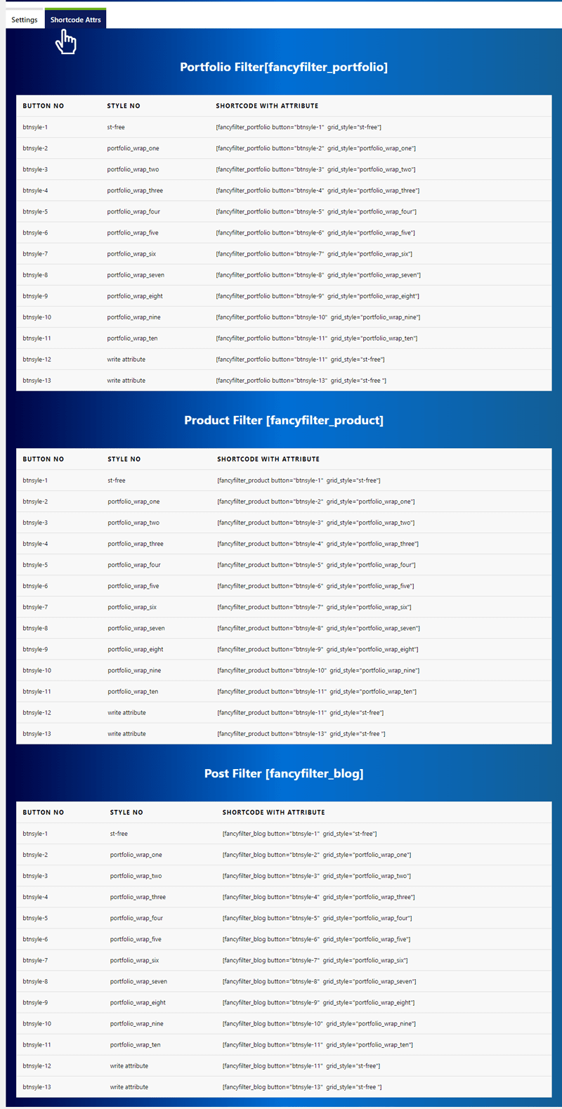 If you want to display the categories you saved on the Plugin Settings page and change the grid style or button style from only the item, Please click ‘Shortcode Atts’ next to the Settings button on the Plugin Settings page, you will see the shortcode attribute options in tabular form